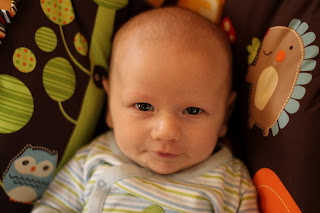 Milestone #3=Jack's first bloodshed. Oh my poor little peanut. I stand by my statement that Mia truly does love her baby brother and wants to be around him a lot; however, come bedtime...she can turn in to another creature and become careless. Mia was very excited about a kids magazine she got in the mail and was waving it around Jack before bed. She tested her boundaries a bit too close and whacked him on the face with her magazine...right below his right eye. I was shocked to find that a few second later, he was bleeding! She had given him a big paper cut kind of thing and he was NOT happy about...neither were we. He was all smiles and just fine soon after, but we really tried to get it in to Mia's head that she must be gentle around babies...or anyone for that matter. You can slightly see his ouchie in the below pic. Mia kept asking if he was all better and if he had blood still. :)